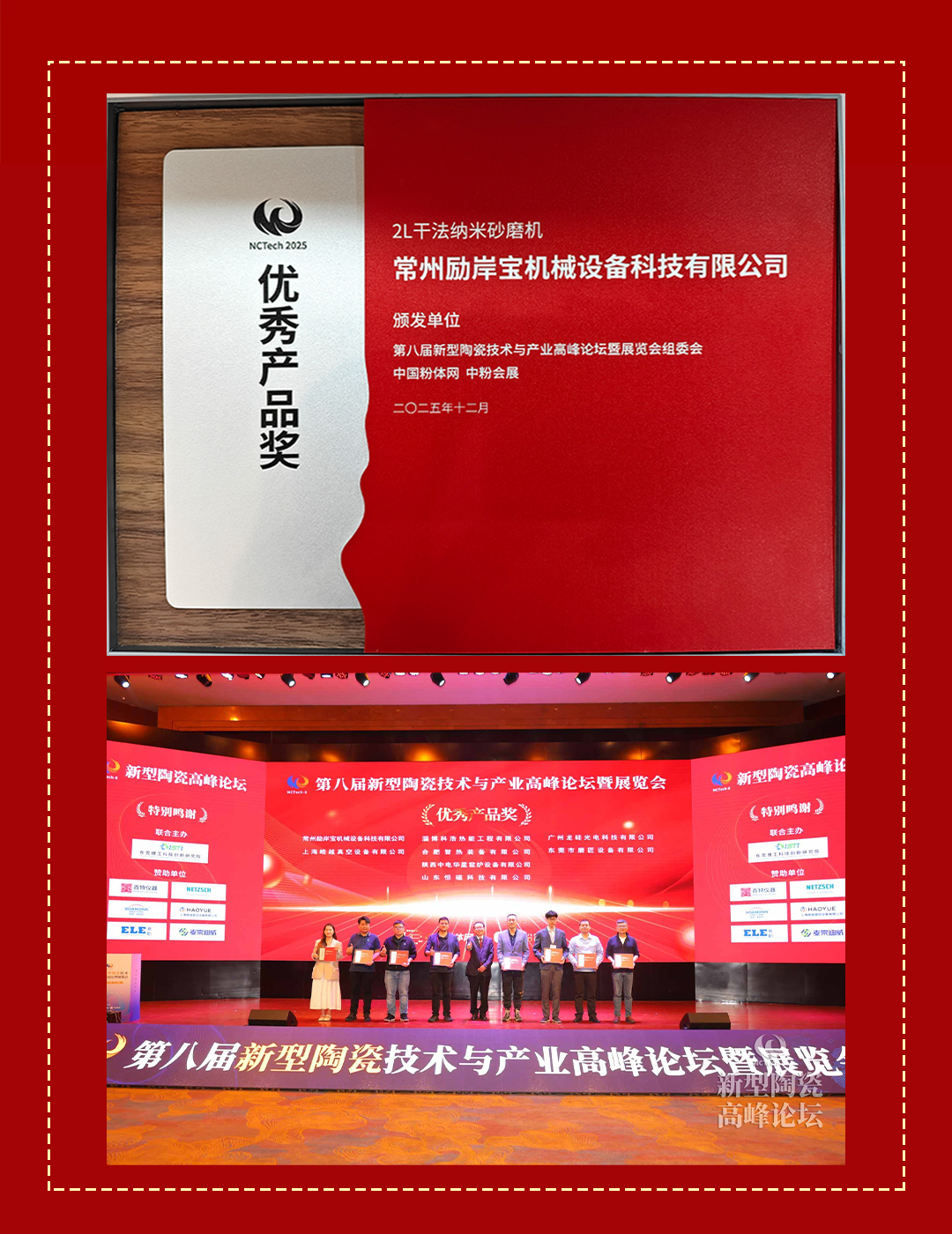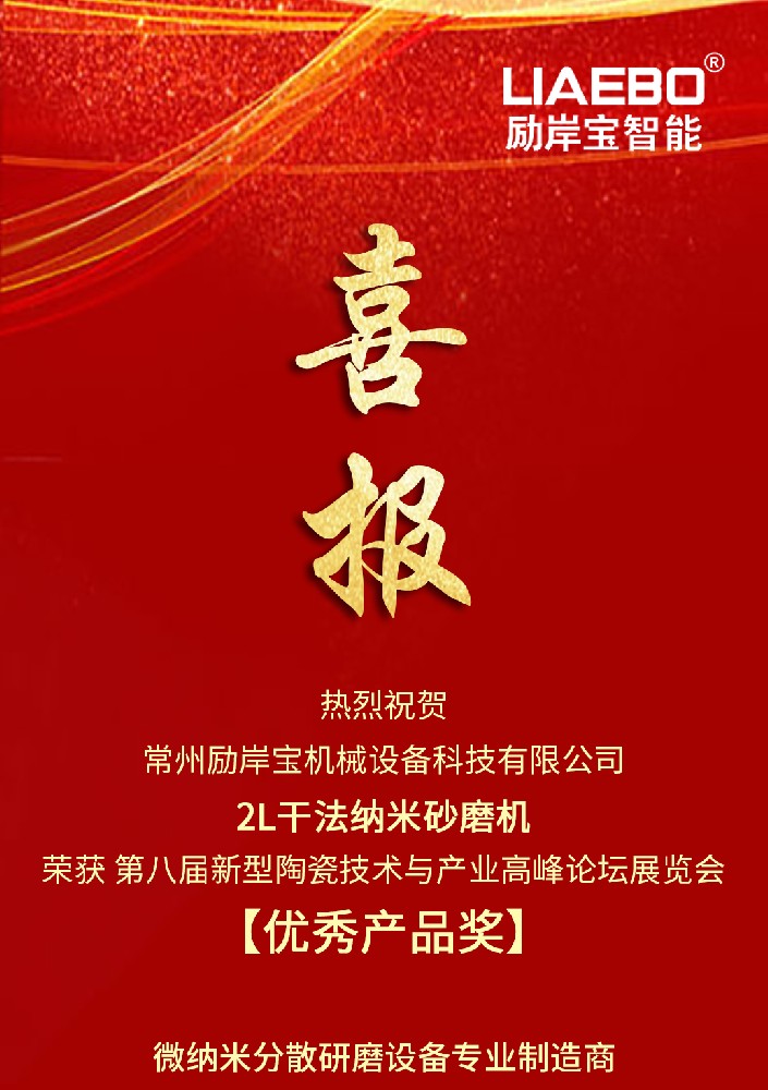 喜報 | 祝賀勵岸寶智能2L干法納米砂磨機榮獲第八屆新型陶瓷技術與產業高峰論壇展覽會【優秀產品獎】
