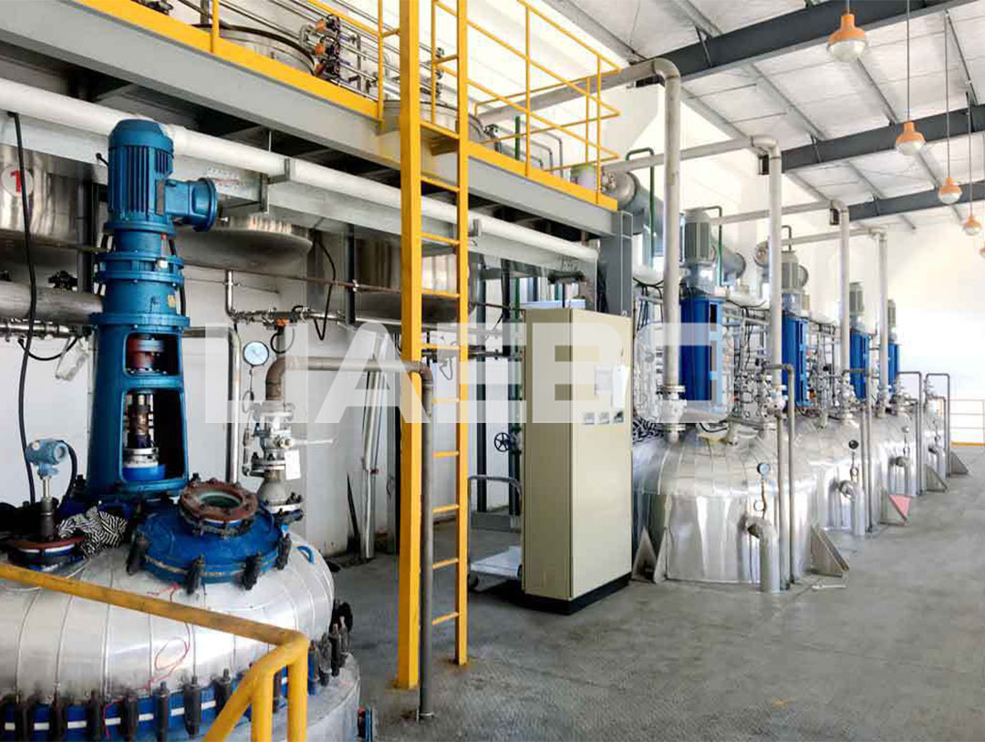 樹脂生產(chǎn)線,主要解決配料、滴加、升溫、降溫、攪拌等過有問題;該生產(chǎn)線5臺5000L高速攪拌反應(yīng)釜;儲罐區(qū)(立式儲罐)自動配料,蒸汽加熱、冷水降溫、自動溫控系統(tǒng),真空上料、真空脫水、滴加釜控制流速、緩慢滴加,冷凝系統(tǒng)、油水分離、液料回收,廢水凈廢水處理后可再循環(huán)使用,流量計控制加料速度。