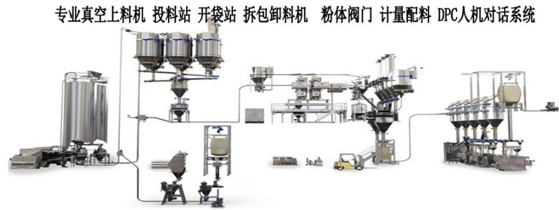 本公司提供的粉體配料系統是運用粉體輸送儲、存設備和各種計量傳感器,對一種或多種粉體物料按量輸送、配比混合及輸送投料的設備系統。是在精細化工、化學、油漆、油脂、藥品、飼料、日用化工、食品、制藥等行業生產過程中常用集成設備,通常是由DCS控制相關設備模塊,如:拆包站、輸送管路、儲存艙、計量倉等組成的自動化配料設備系統。例如:反應釜的粉體投料控制、滑石粉、樹脂、飼料等粉體成品包裝配比。