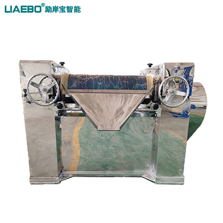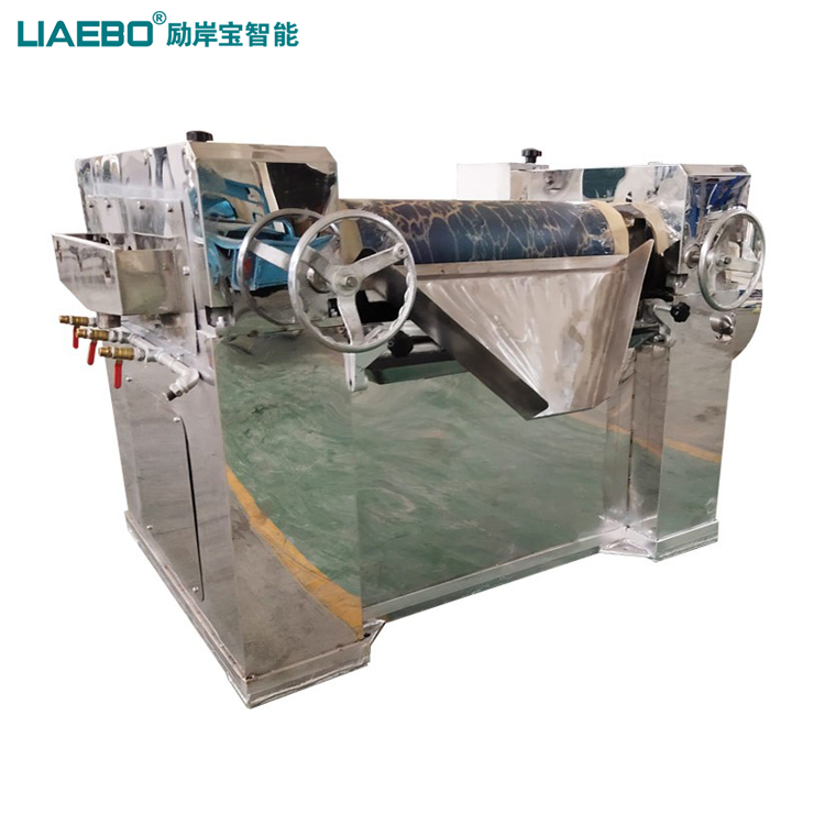 三輥研磨機主要用于各種油漆、油墨、顏料、塑料、食品等膏狀漿料之用,主要為油漆、油墨等高粘度物料的研磨分散之主要設備。該機通過機器水平方向排列的三根輥筒表面相互擠軋及不同的速度的摩擦而達到研磨作用,研磨物料一般只要研磨二次就可以達到要求,難研物料必須研磨多次,方能達到要求。工作時將快、慢輥調節到適當位置,啟動機器,然后將需研磨的漿料加入中輥與慢輥之間銅刀處,漿料經過中、慢輥表面研磨后,由中輥帶給快輥,再由緊貼表面的出料刮刀予以刮下,通過裝有擋板的刀板,流入盛料筒,由此構成整個研磨過程。